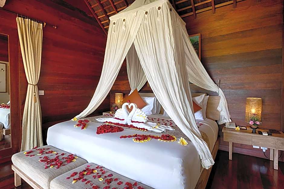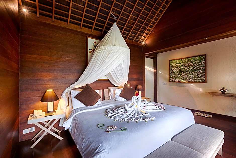 Offering views of the rice fields, this villa features an outdoor infinity-edged private pool. The bedroom is air-conditioned and fitted with a flat-screen cable TV with DVD player, iPod dock, wardrobe, and a personal safe. There is also an private bathroom featuring shower and spa bath facilities. Free toiletries, slippers, fresh towels and linen are provided.