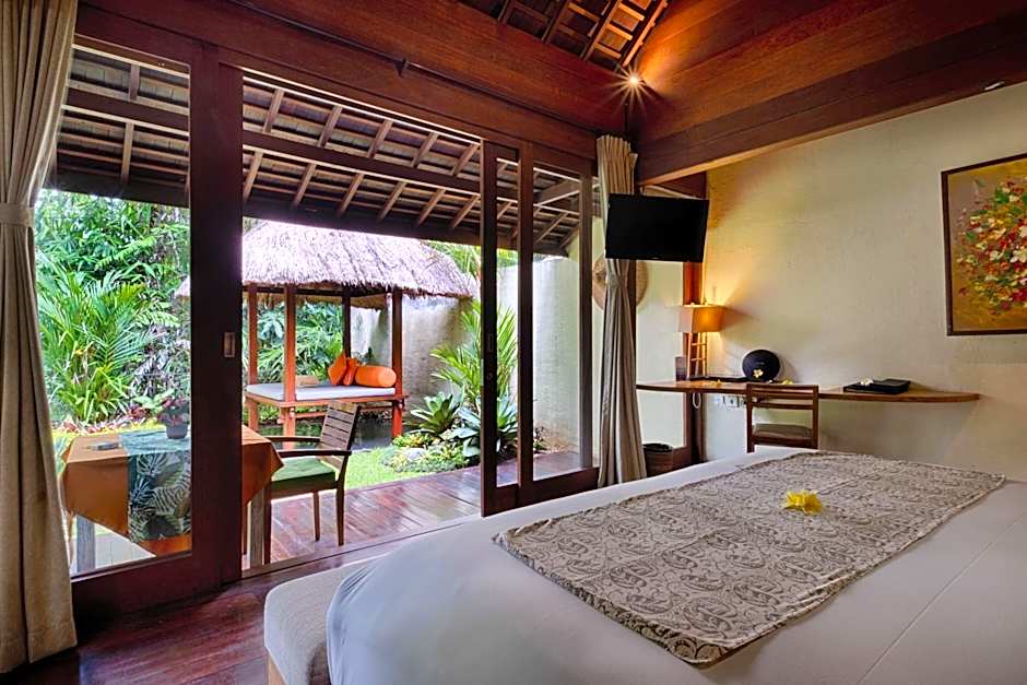 Offering views of the rice fields, this villa features an outdoor infinity-edged private pool. The bedroom is air-conditioned and fitted with a flat-screen cable TV with DVD player, iPod dock, wardrobe, and a personal safe. There is also an private bathroom featuring shower and spa bath facilities. Free toiletries, slippers, fresh towels and linen are provided. Guests can enjoy a relaxing afternoon sunbathing by the pool or simply catch up on readings at the gazebo/terrace